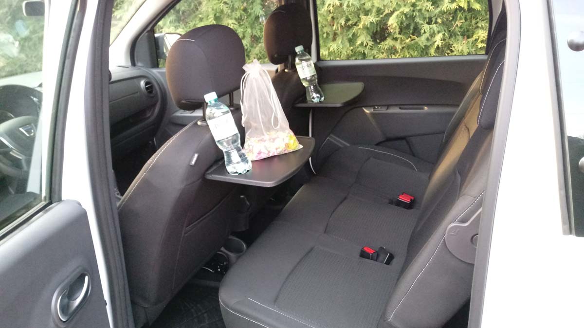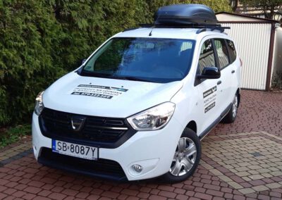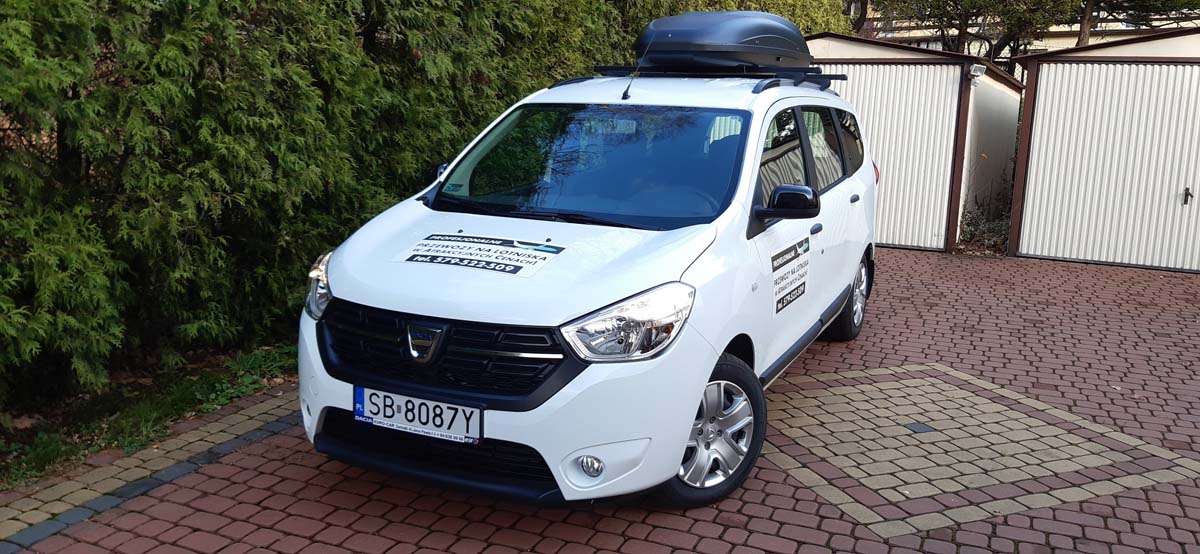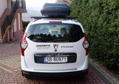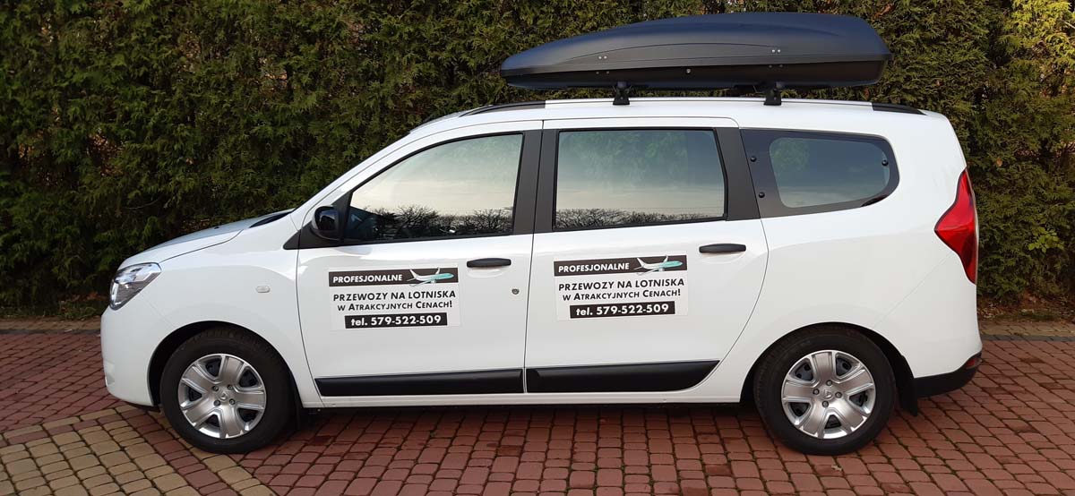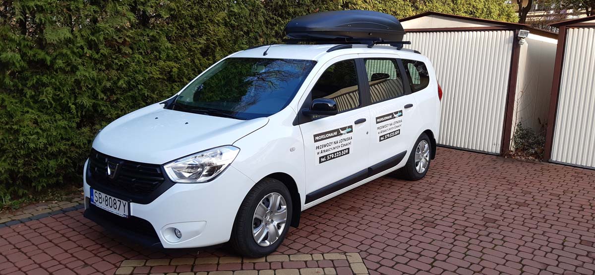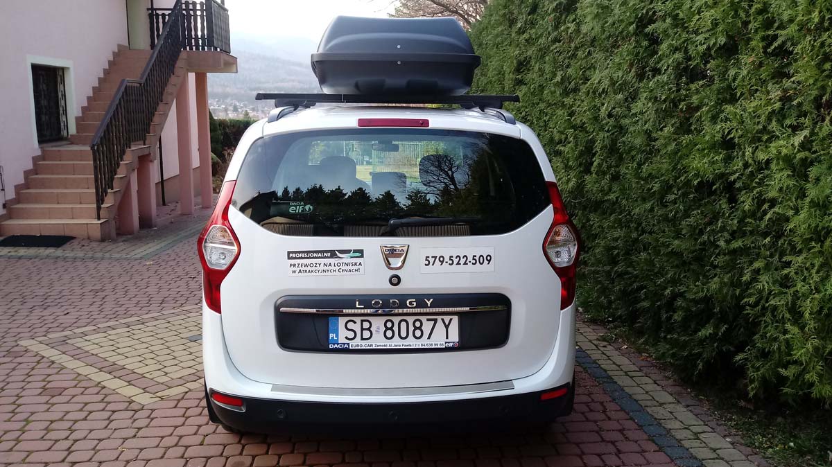 A new one, bought in a Polish car showroom, comfortable with a spacious trunk and additional roof trunk